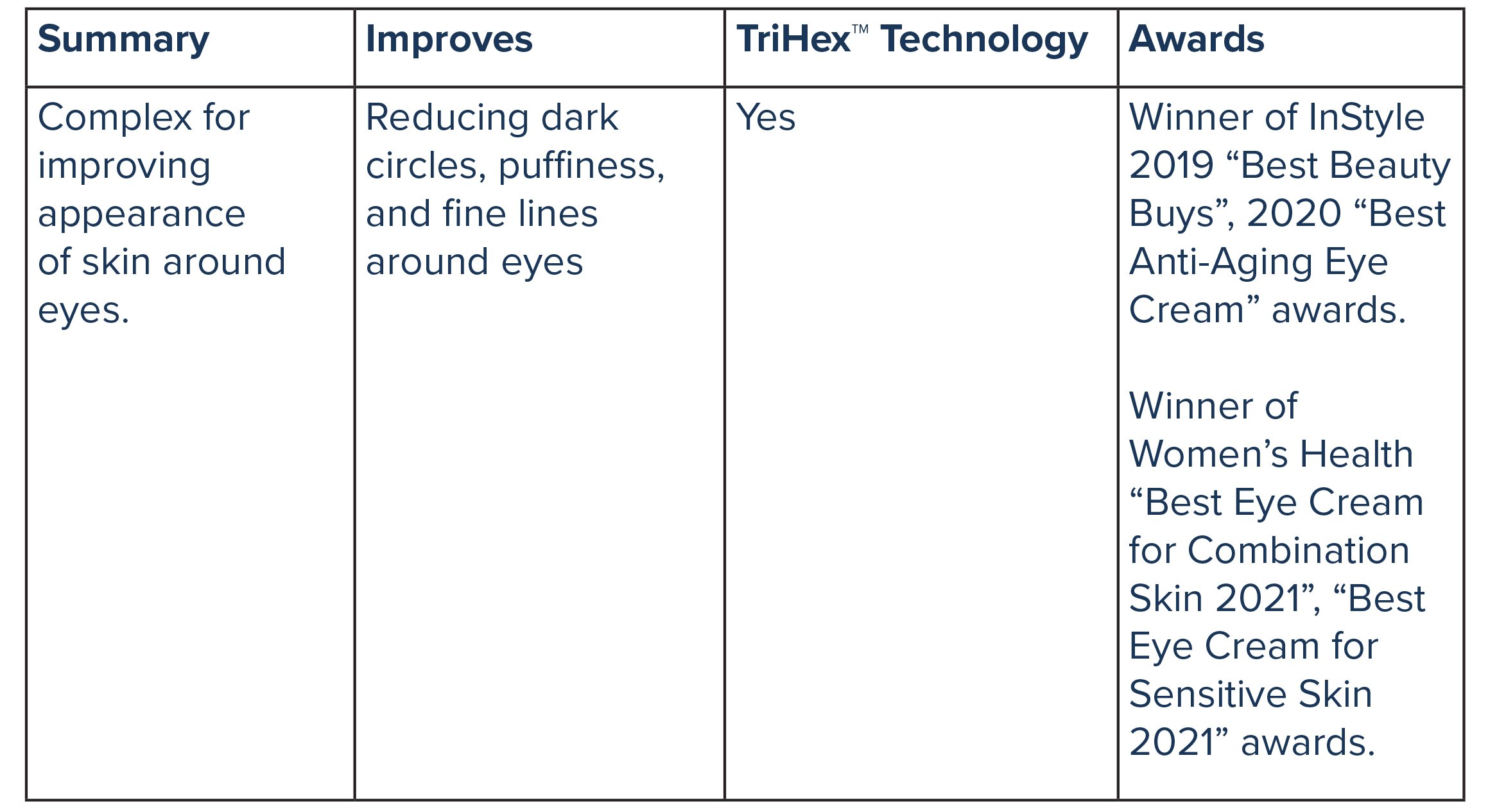 Targeting eyes bags, wrinkles, skin firmness, and puffiness. This complex is designed to improve skin around and under the eyes.